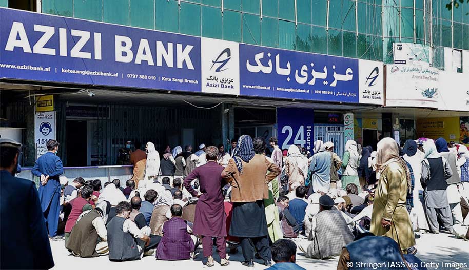 Yhdysvaltain presidentti Joe Bidenin hallinto jäädytti 9,5 miljardia dollaria Da Afghanistan -pankin varoista elokuussa. EU tuli pian perässä ja vetäytyi 1,4 miljardin dollarin kehitys- ja kriisiapurahoituksesta, joka oli luvattu antaa Afganistanin terveydenhuollolle, maataloudelle ja viranomaistoiminnalle vuosille 2021–2025. Tämän johdosta 2000 terveysasemaa jouduttiin sulkemaan. Ne olivat palvelleet noin 30 miljoonaa afganistanilaista.