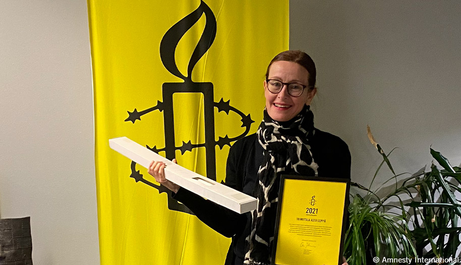 Asta Leppä vastaanotti palkinnon Amnestyn toimistolla.