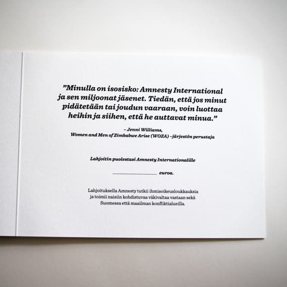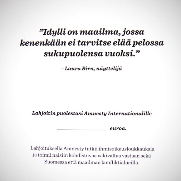 Hyvää tekevällä aineettomalla lahjalla teet ystäväsi puolesta lahjoituksen Amnestylle ja olet mukana tukemassa Amnestyn työtä naisiin kohdistuvaa väkivaltaa vastaan. Lahjoituksen avulla teemme vaikuttamistyötä, jotta Suomen valtio lisäisi apua tarvitseville neuvonta- ja terveyspalveluita, ja tekisi turvakotiverkostosta saavutettavan kaikille ja kaikkialla.